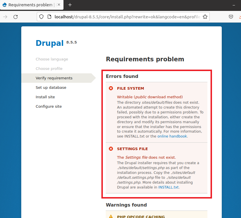 Step 11: Due to the permission drupal installation directory, it will shows an error message as shown below.
