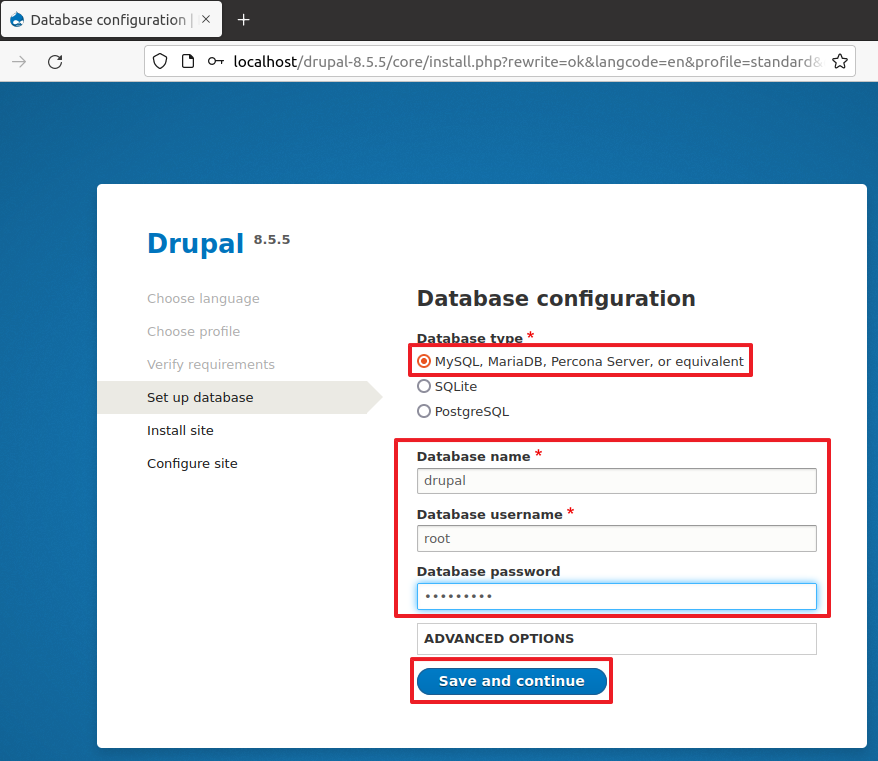 Step 14: Provide the database name created for drupal and MySQL credential.
