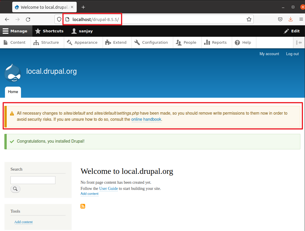 Step 17: Once done it’s successfully login to the drupal instance and it suggest to reset the permission.