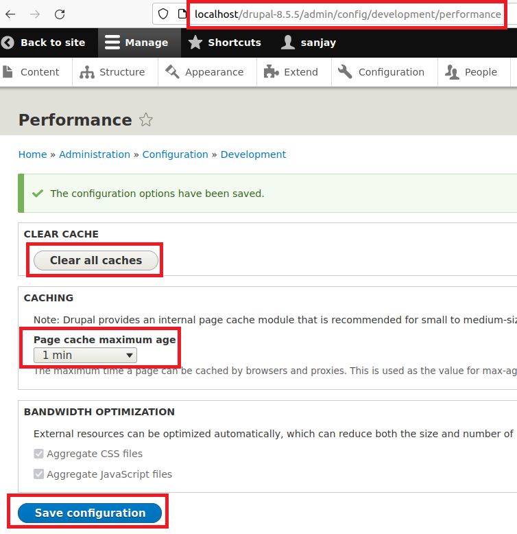http://localhost/drupal-8.5.5/admin/config/development/performance