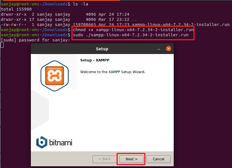 Step 2: To install xampp, run the following command and follow the instructions on the installer and complete the installation using default installer options.