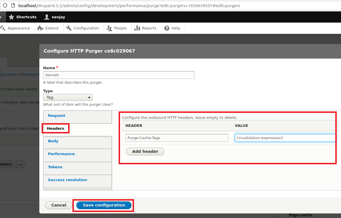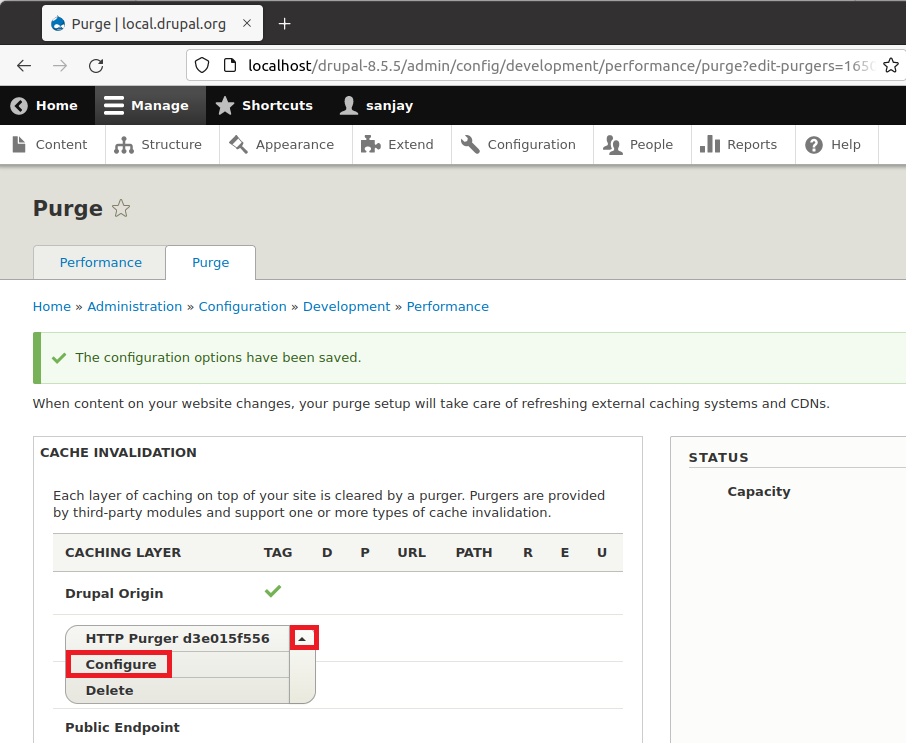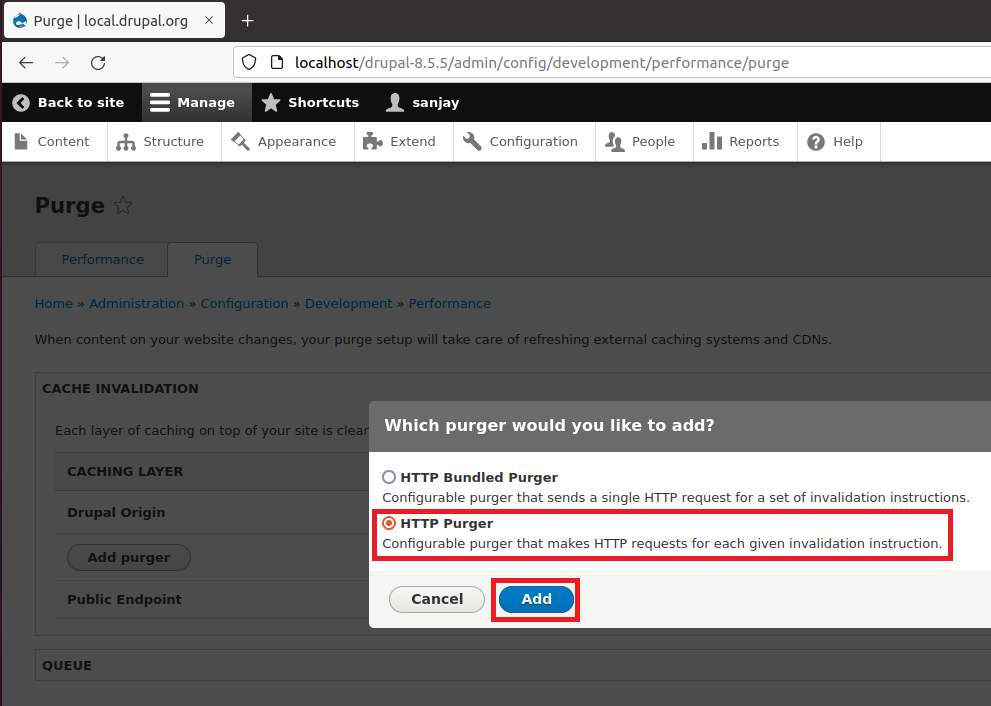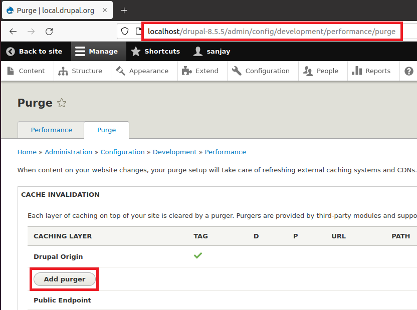 Step 24: Navigate to the http://localhost/drupal-8.5.5/admin/config/development/performance/purge and click on “Add purger” button..