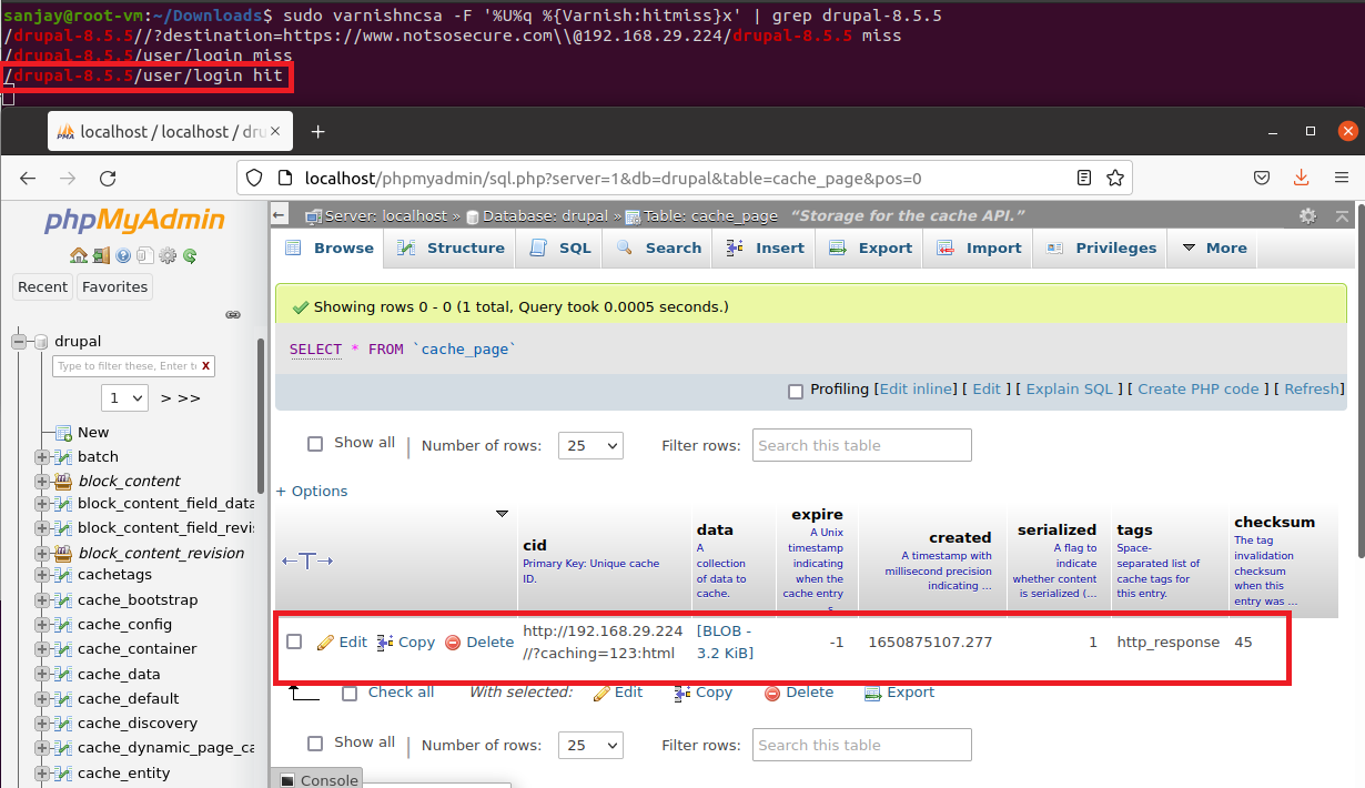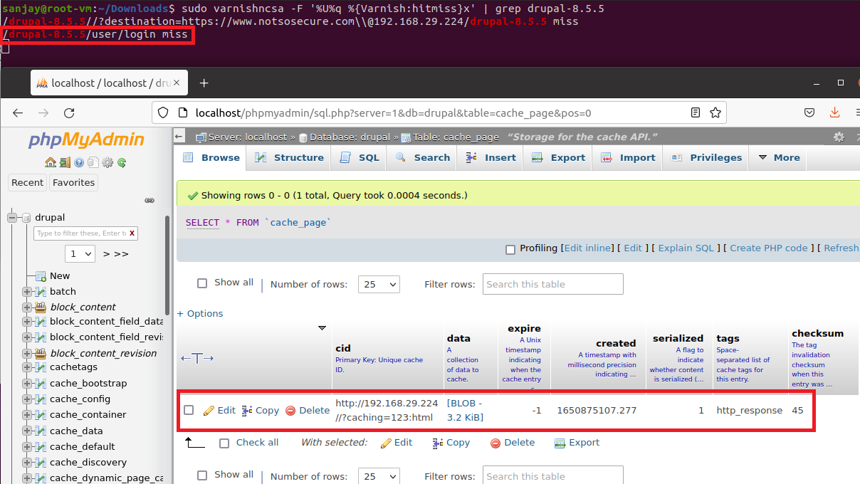 Step 37: Observe the the varnish creates the new entry for “/drupal-8.5.5/user/login”, but when it sends to internal cache it responds with the content of cached URL “//?caching=123:html”.