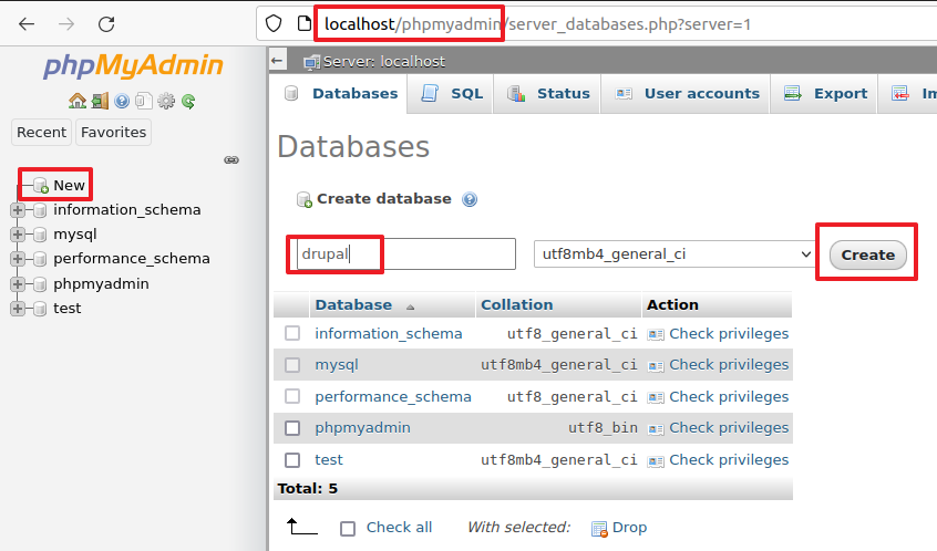 Step 4: Navigate to “localhost/phpmyadmin” in browser and click on “New” link to create new database for drupal instance.