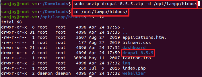 sudo unzip drupal-8.5.5.zip -d /opt/lampp/htdocs