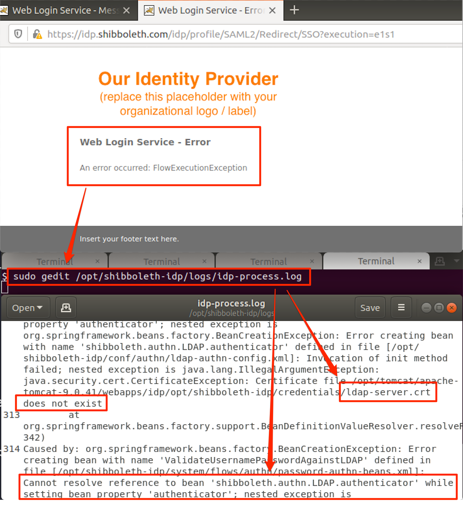 Once all the error related to SP configuration resolved, The SP application respond with “FlowExecutionException” as shown in figure, That means in order to make the SP works, it is required to configure LDAP Server.
